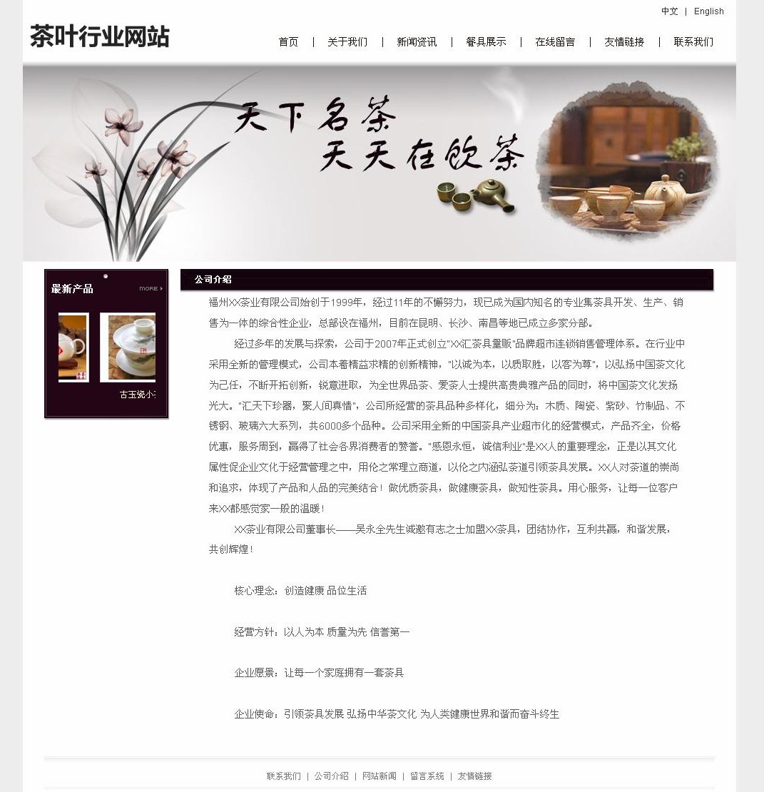 經(jīng) 過(guò)多年的發(fā)展與探索,公司于2007年正式創(chuàng)立“XX匯茶具量販”品牌超市連鎖銷售管理體系。在行業(yè)中采用全新的管理模式,公司本著精益求精的創(chuàng)新精神, “以誠(chéng)為本,以質(zhì)取勝,以客為尊”,以弘揚(yáng)中國(guó)茶文化為己任,不斷開(kāi)拓創(chuàng)新,銳意進(jìn)取,為全世界品茶、愛(ài)茶人士提供高貴典雅產(chǎn)品的同時(shí),將中國(guó)茶文化發(fā)揚(yáng) 光大。“匯天下珍器,聚人間真情”,公司所經(jīng)營(yíng)的茶具品種多樣化,細(xì)分為:木質(zhì)、陶瓷、紫砂、竹制品、不銹鋼、玻璃六大系列,共6000多個(gè)品種。公司采 用全新的中國(guó)茶具產(chǎn)業(yè)超市化的經(jīng)營(yíng)模式,產(chǎn)品齊全,價(jià)格優(yōu)惠,服務(wù)周到,贏得了社會(huì)各界消費(fèi)者的贊譽(yù)。“感恩永恒,誠(chéng)信利業(yè)”是XX人的重要理念,正是以 其文化屬性促企業(yè)文化于經(jīng)營(yíng)管理之中,用倫之常理立商道,以倫之內(nèi)涵弘茶道引領(lǐng)茶具發(fā)展。XX人對(duì)茶道的崇尚和追求,體現(xiàn)了產(chǎn)品和人品的完美結(jié)合!做優(yōu)質(zhì) 茶具,做健康茶具,做知性茶具。用心服務(wù),讓每一位客戶來(lái)XX都感覺(jué)家一般的溫暖!