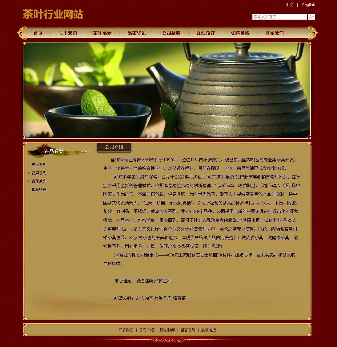 經(jīng)過多年的發(fā)展與探索,公司于2007年正式創(chuàng)立“XX匯茶具量販”品牌超市連鎖銷售管理體系。在行業(yè)中采用全新的管理模式,公司本著 精益求精的創(chuàng)新精神,“以誠為本,以質(zhì)取勝,以客為尊”,以弘揚中國茶文化為己任,不斷開拓創(chuàng)新,銳意進取,為全世界品茶、愛茶人士提供高貴典雅產(chǎn)品的同 時,將中國茶文化發(fā)揚光大。“匯天下珍器,聚人間真情”,公司所經(jīng)營的茶具品種多樣化,細分為:木質(zhì)、陶瓷、紫砂、竹制品、不銹鋼、玻璃六大系列,共 6000多個品種。公司采用全新的中國茶具產(chǎn)業(yè)超市化的經(jīng)營模式,產(chǎn)品齊全,價格優(yōu)惠,服務(wù)周到,贏得了社會各界消費者的贊譽。“感恩永恒,誠信利業(yè)”是 XX人的重要理念,正是以其文化屬性促企業(yè)文化于經(jīng)營管理之中,用倫之常理立商道,以倫之內(nèi)涵弘茶道引領(lǐng)茶具發(fā)展。XX人對茶道的崇尚和追求,體現(xiàn)了產(chǎn)品 和人品的完美結(jié)合!做優(yōu)質(zhì)茶具,做健康茶具,做知性茶具。用心服務(wù),讓每一位客戶來XX都感覺家一般的溫暖!